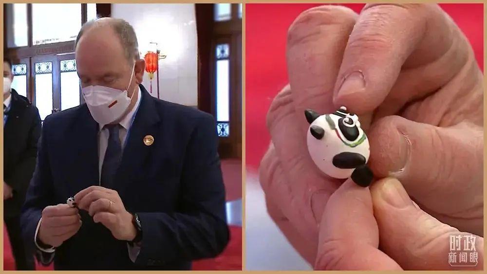 阿尔贝二世正饶有兴致地盯着“冰墩墩”面塑。(总台央视记者杨波拍摄)