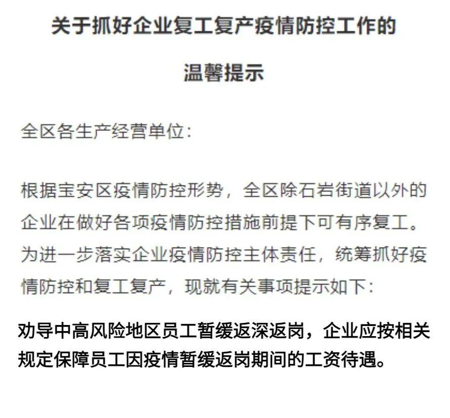 中高风险地区员工被劝导暂缓返深返岗