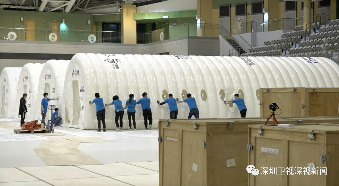 7日晚,记者在马鞍山体育馆现场看到:多个气模实验室模组正在充气当中,现场可见“华大基因”标志,体育馆内置有多个木箱,箱内物品包括木板、海棉、床架等。工作人员展开设置工作,并为场馆地板铺设保护层。