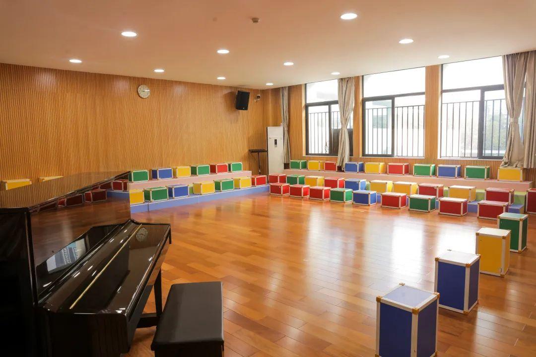 这里有光洁的优质木地板,黑亮的钢琴,拍起来得心应手的大鼓,多功能五线谱电教平台,可移动合唱台,将科技与音乐完美融合,让音乐教学更加得心应手。