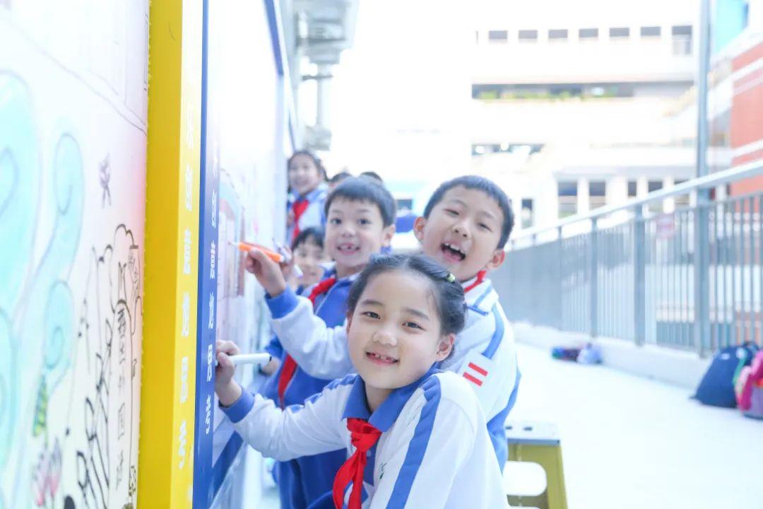 连着美术室走廊的则是一排可供孩子们自主设计、细心勾画的涂鸦墙。孩子们在这里自由地构思,无限地想象,一笔一画都散发着天真浪漫的气息,童趣盎然的画面让人流连忘返。