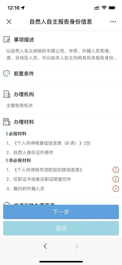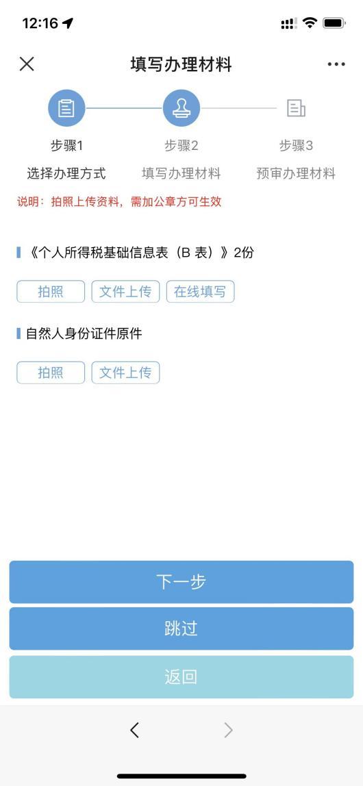 上传办理资料(此处以精准预约下的“自然人身份信息报告”为例),也可选择【跳过】,到现场提交资料。