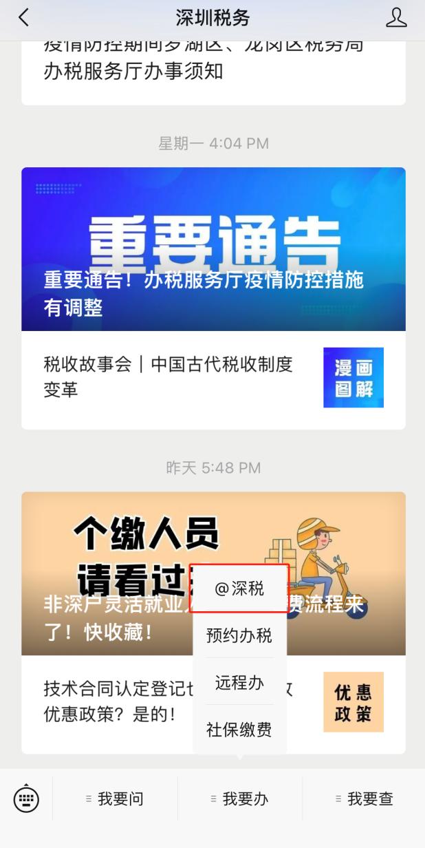 服务入口:“深圳税务”微信公众号菜单栏【我要办】-【@深税】