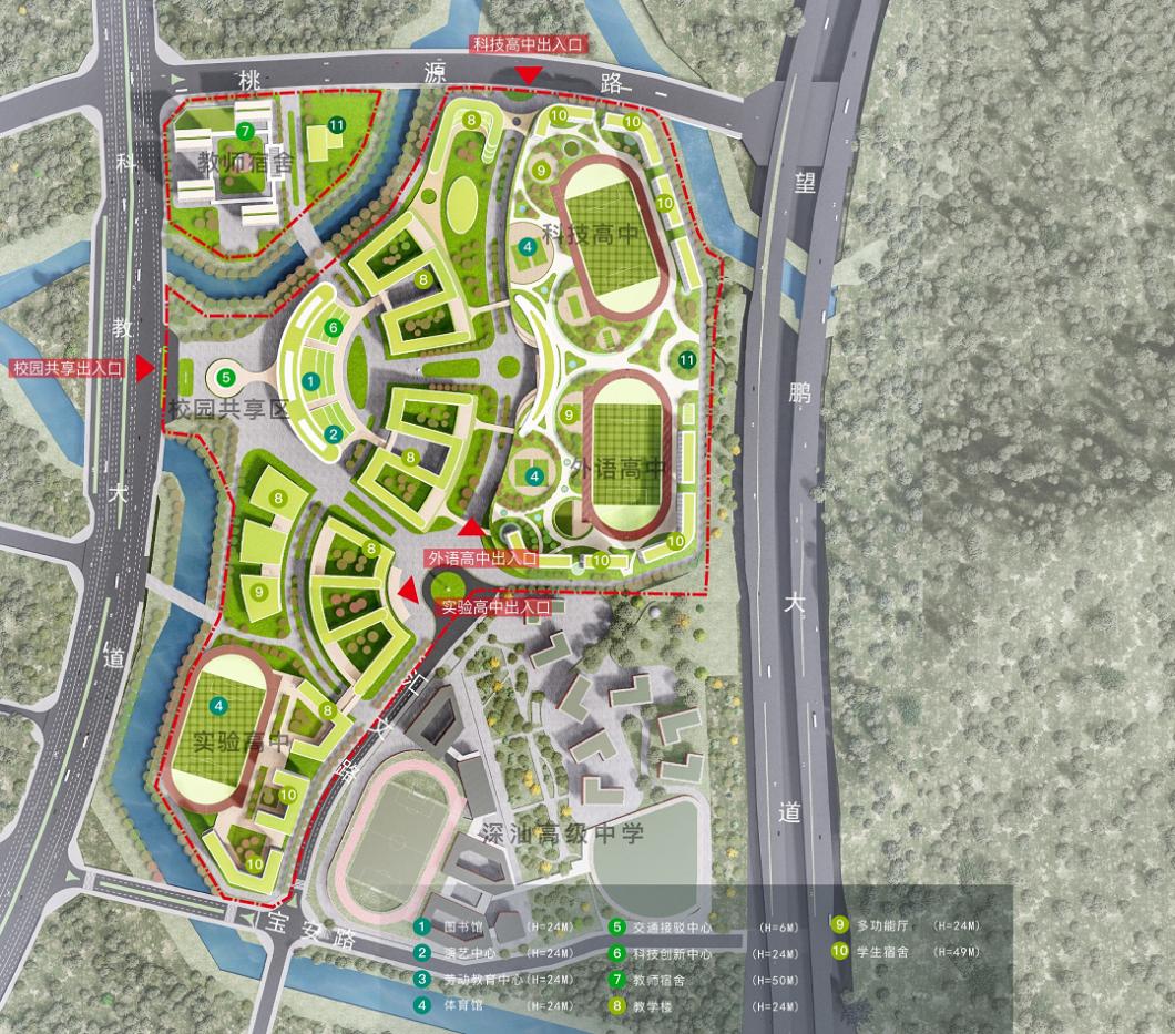 此外,深圳中学高中园周边四条配套道路采用“市投区建”模式,确保高中园建成运营后同步交付使用;校园内按规范配置教师周转公寓,在校园周边配置人才房满足教师合理需求。