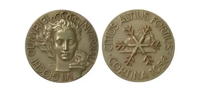 奖牌的正面是一位面容姣好的女性的头像,她戴有奥运五环式的皇冠,奥运火炬在头像前方,奖牌周围刻有“第七届冬奥会”的字样。奖牌背面是冬奥会的标志符号—一片雪花覆盖在一座雪山上,并刻有"更快,更高,更强”和“科蒂纳丹佩佐1956"字样。