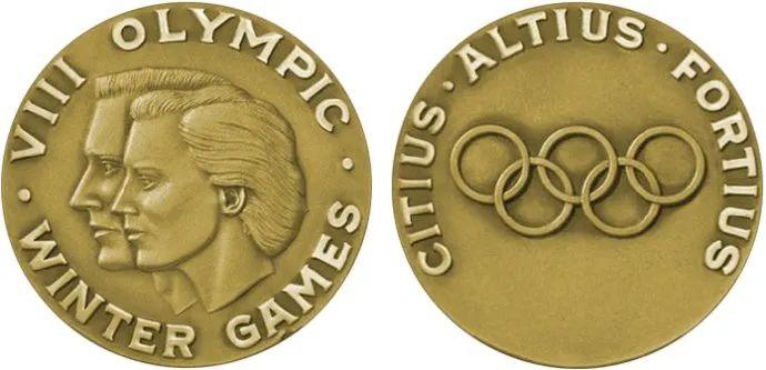 奖牌正面,是两个年轻男女的侧面头像,代表着世界和美国的朝气蓬勃。边缘刻有“第八届冬奥会”字样。