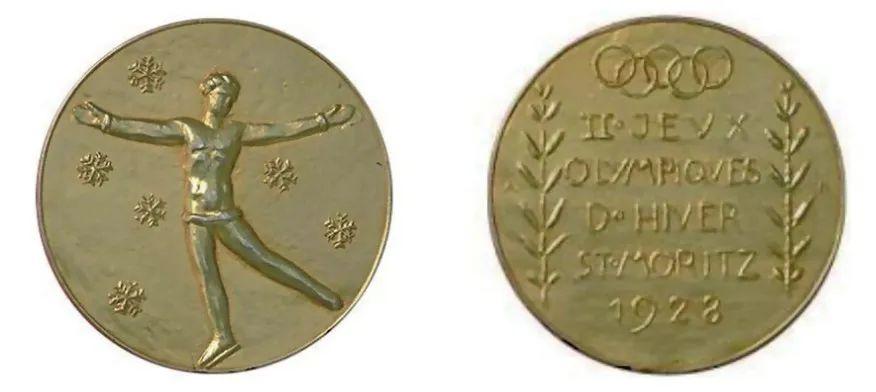 奖牌的正面是一个张开双臂的滑冰运动员,在其周围有片片雪花慢慢飘落,背面最上边是奥运五环的造型,下边是铭文“圣莫里茨冬奥会1928”,在铭文的两边分别装饰着橄榄枝。