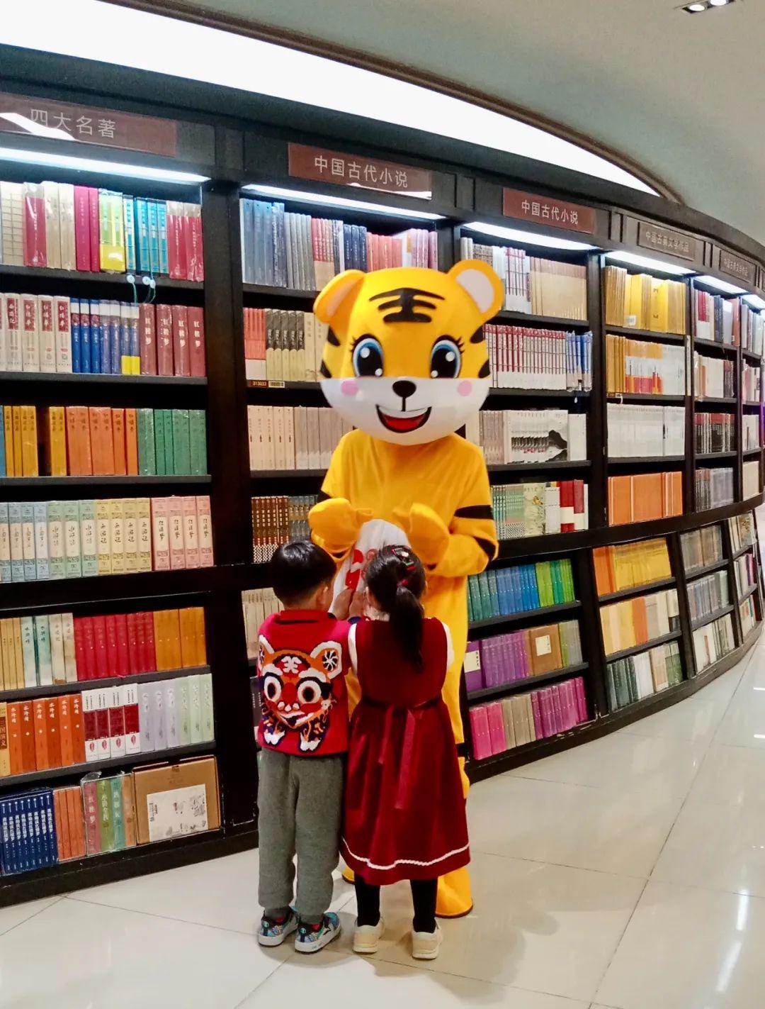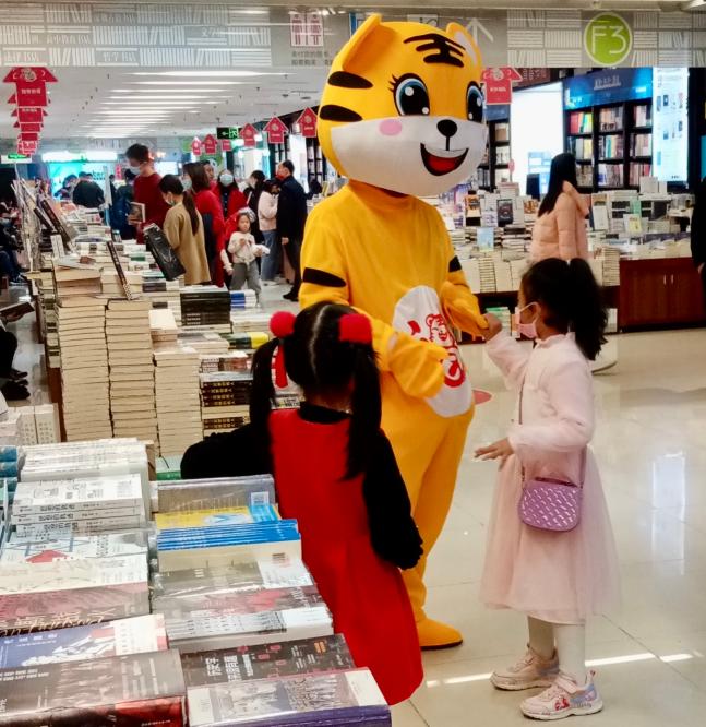 年初四,大王来巡山。工作人员扮成萌萌哒吉祥虎,书城出没,逐层巡山,给在场的大小读者朋友们拜年,并送上诚挚的新年祝福。