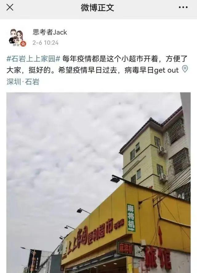 “#石岩上上家园# 每年疫情都是这个小超市开着,方便了大家,挺好的。希望疫情早日过去,病毒早日get out。”