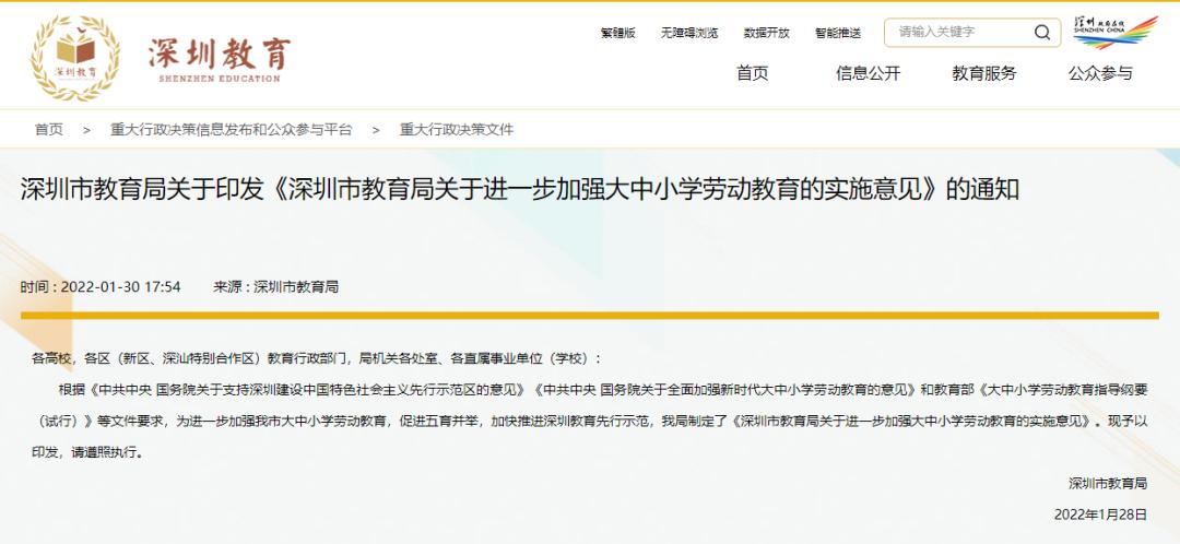 要统筹劳动教育资源,建立家庭劳动教育、学校劳动教育和社会劳动教育“三位一体”协同实施机制。建立具有深圳特色的校内校外结合、课程体系完善、资源丰富多样、体制机制健全的劳动教育体系,形成家庭劳动教育日常化、学校劳动教育常态化、社会劳动教育多样化的协同育人格局,实现劳动教育先行示范。到2025年,要建设100个校外劳动教育基地,创建100所劳动教育示范学校,培养100名劳动教育名师,开发系列劳动教育课程。