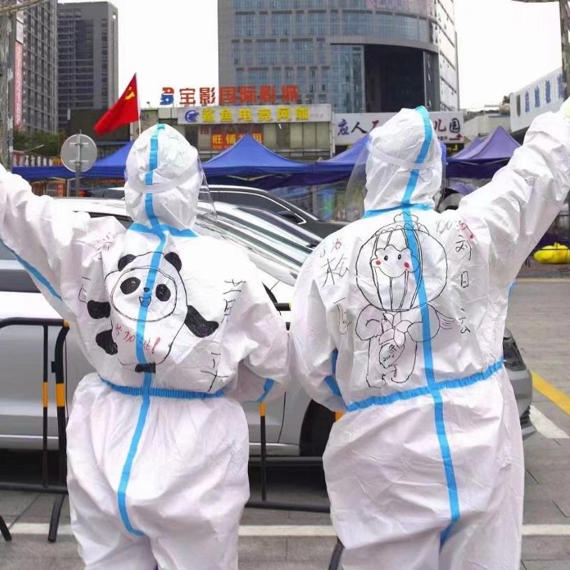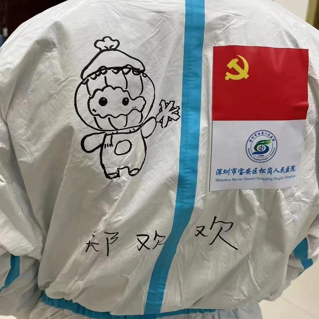 正月的深圳仍然寒冷,采样工作要坚守到半夜,对现场医护人员的体力是极大的考验,他们在自己的防护服上绘起了冰墩墩,为冬奥会加油,也为自己和队友们鼓劲打气。