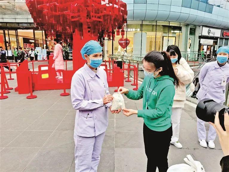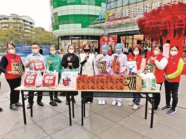 当天上午,海雅缤纷城还在线上号召商家给防疫人员送温暖。不到1个小时,就得到KUMO KUMO、星巴克、瑞幸咖啡、胖哥俩、全棉时代、海雅缤纷城食堂等响应。中午12点,爱心商户代表把热饮、轻食、消毒湿巾等关爱品送到该核酸检测点,并给医护人员、志愿者、社区工作人员加油鼓劲。