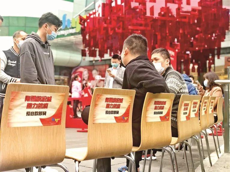 “我们商场严格落实区新冠肺炎疫情防控工作要求,控制商场超市和餐饮单位的人流量,刚好有些商户一部分凳子暂时闲置,大家就想着提供给防疫人员和有需要的市民歇歇脚。尤其看到医护人员、志愿者和社区工作者,一站就是好几个小时,真的很辛苦。”海雅缤纷城相关负责人介绍道。