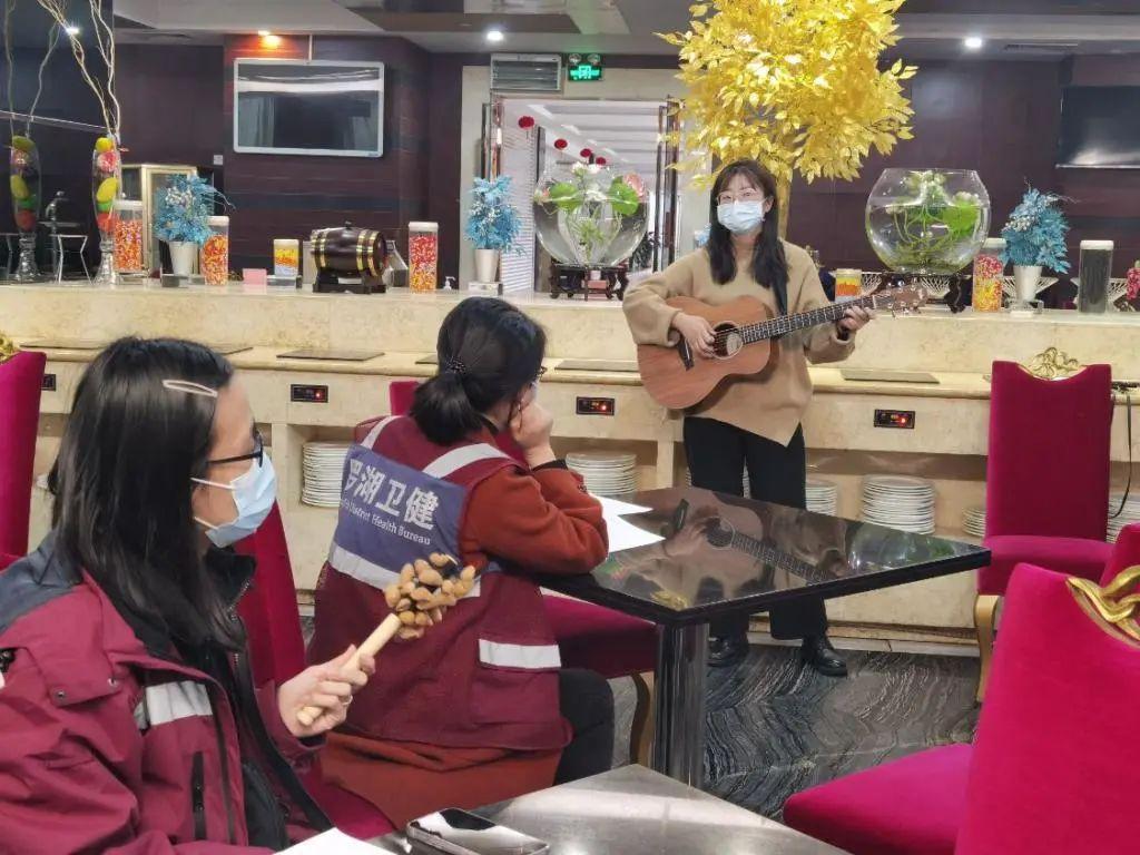 同在当天下午,罗湖区精神卫生中心音乐治疗师沈芊宜带着海洋鼓、吉他等乐器,请指挥部的 30 来名工作人员暂停手里的工作,坐到了文锦广场的自助餐厅里,一起歌唱和聆听音乐,让音乐 " 照顾 " 心灵。