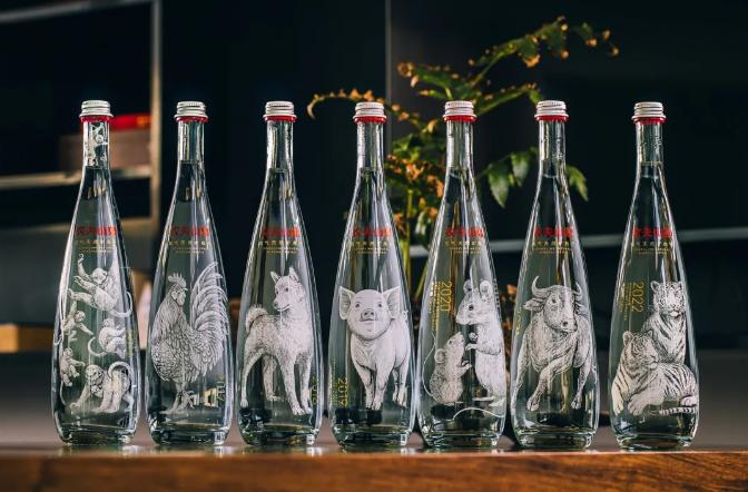 自2016年以来,农夫山泉相继推出了金猴瓶、金鸡瓶、金狗瓶、金猪瓶、金鼠瓶、金牛瓶六款只送不卖的限定版产品,玻璃瓶设计历经58稿,极具艺术价值。并且每年都会重新设计图案,每只动物的描绘都精致到细微之处。
