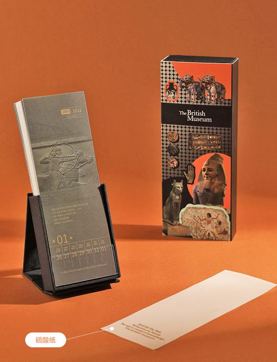 大英博物馆2022年馆藏周历极具特色,极简的设计融入博物馆的馆藏特色,硫酸纸的内页表面烫金博物馆的名言:“愿汝至此千年,徜徉知识圣殿”,大气彰显博物馆的恢弘气势。