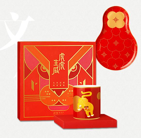 文创大户自然少不了故宫博物院,今年的故宫文创推出了一款虎虎生威马克杯,创意来源于明代红地奔虎五毒妆花纱裱片,虎杯以虎纹样为主体视觉,内壁配上吉语“虎虎生威”作为装饰,托盘以葫芦为基础造型,取自“福禄”谐音,寓意吉祥。