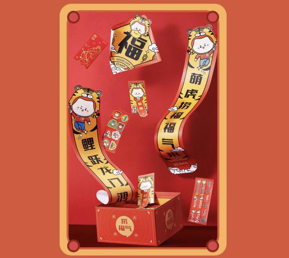 新年转运福气包包含萌虎新春福字、新春对联以及新年红包、萌虎贴纸,在遍地都是文创对联的时候海底捞也加入了大队伍。创意红包中包含着对新年的美好祝福,“旺财、躺赢、暴富、无忧、脱单、加薪”,仿佛拆盲盒的惊喜。
