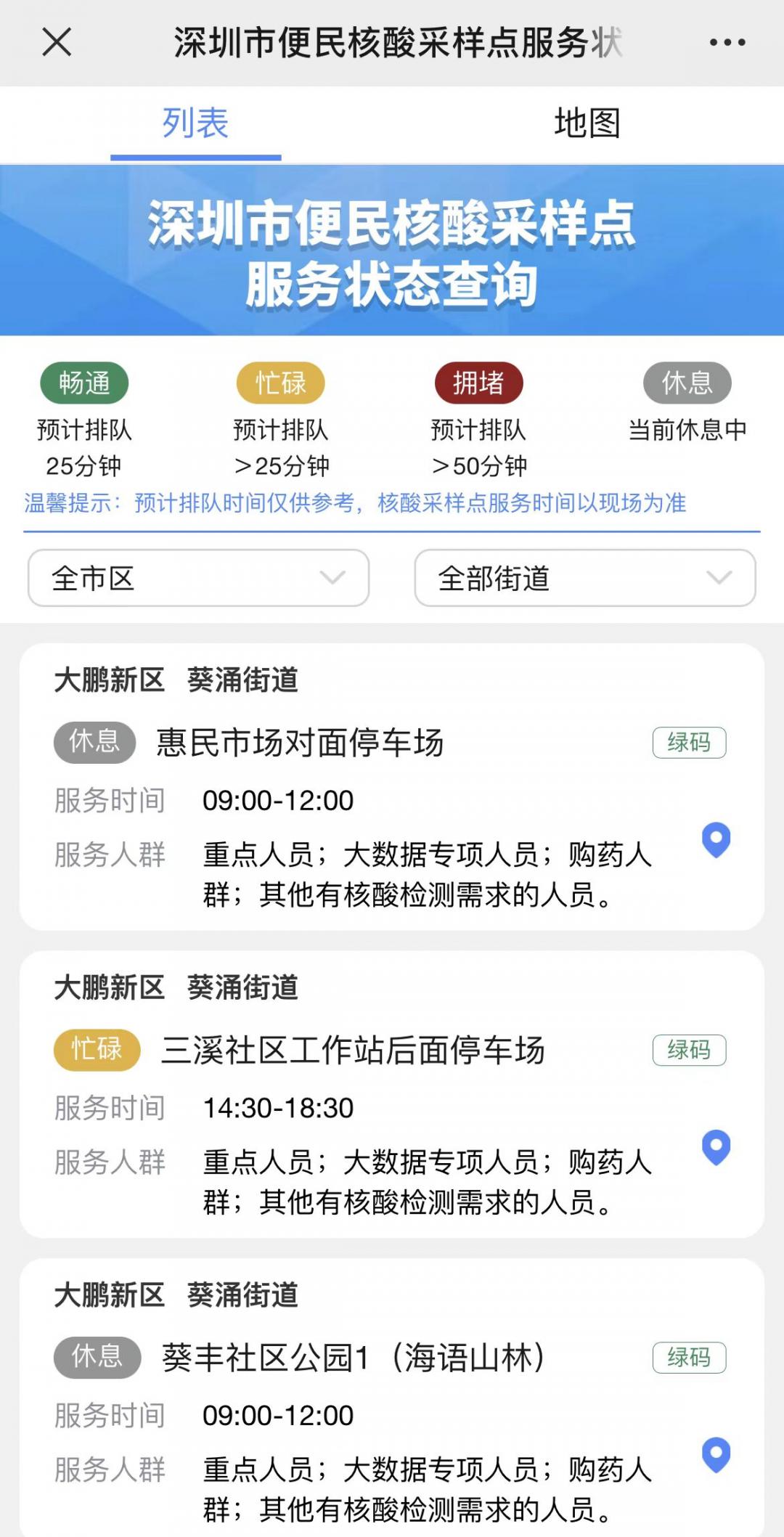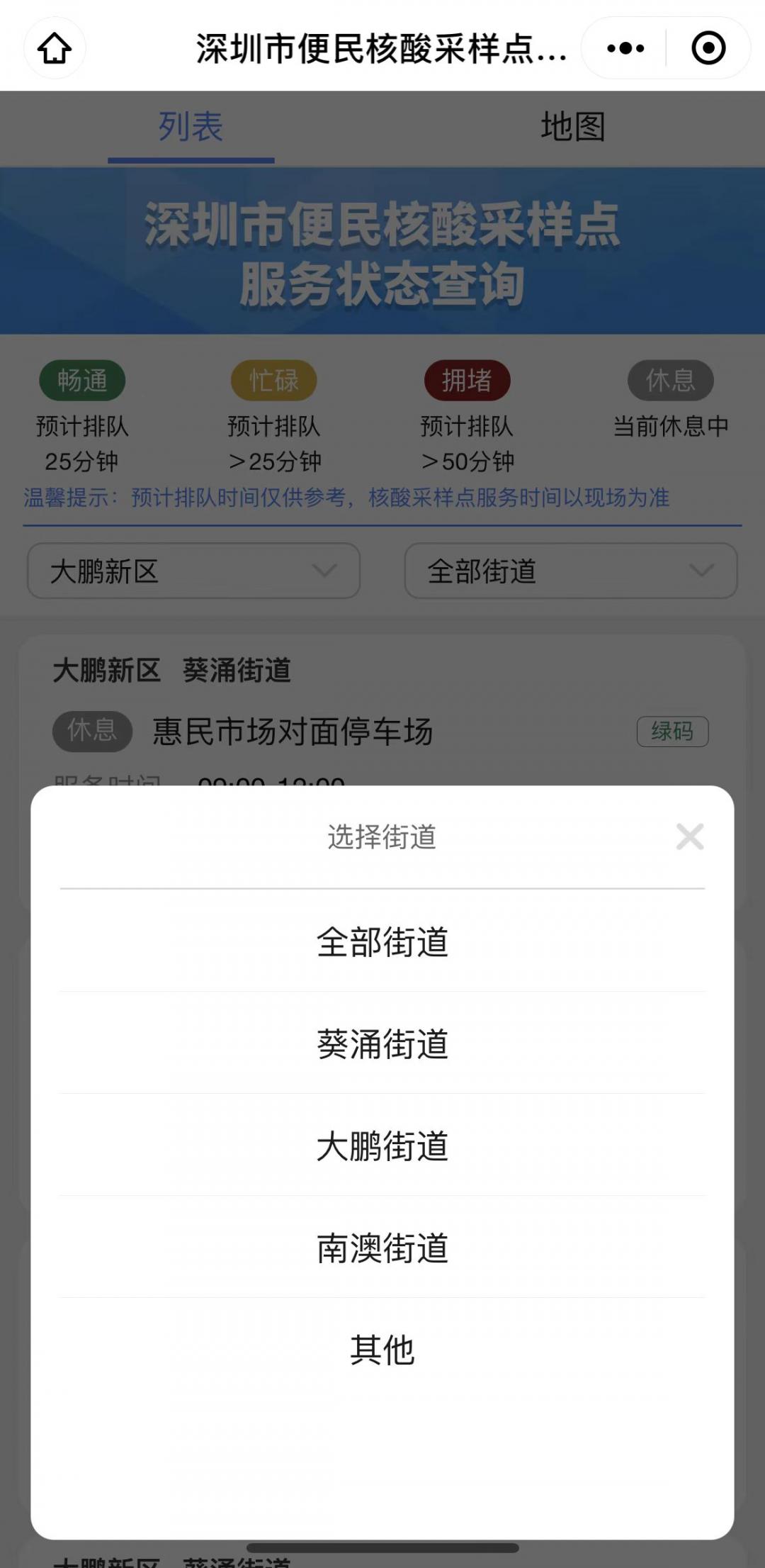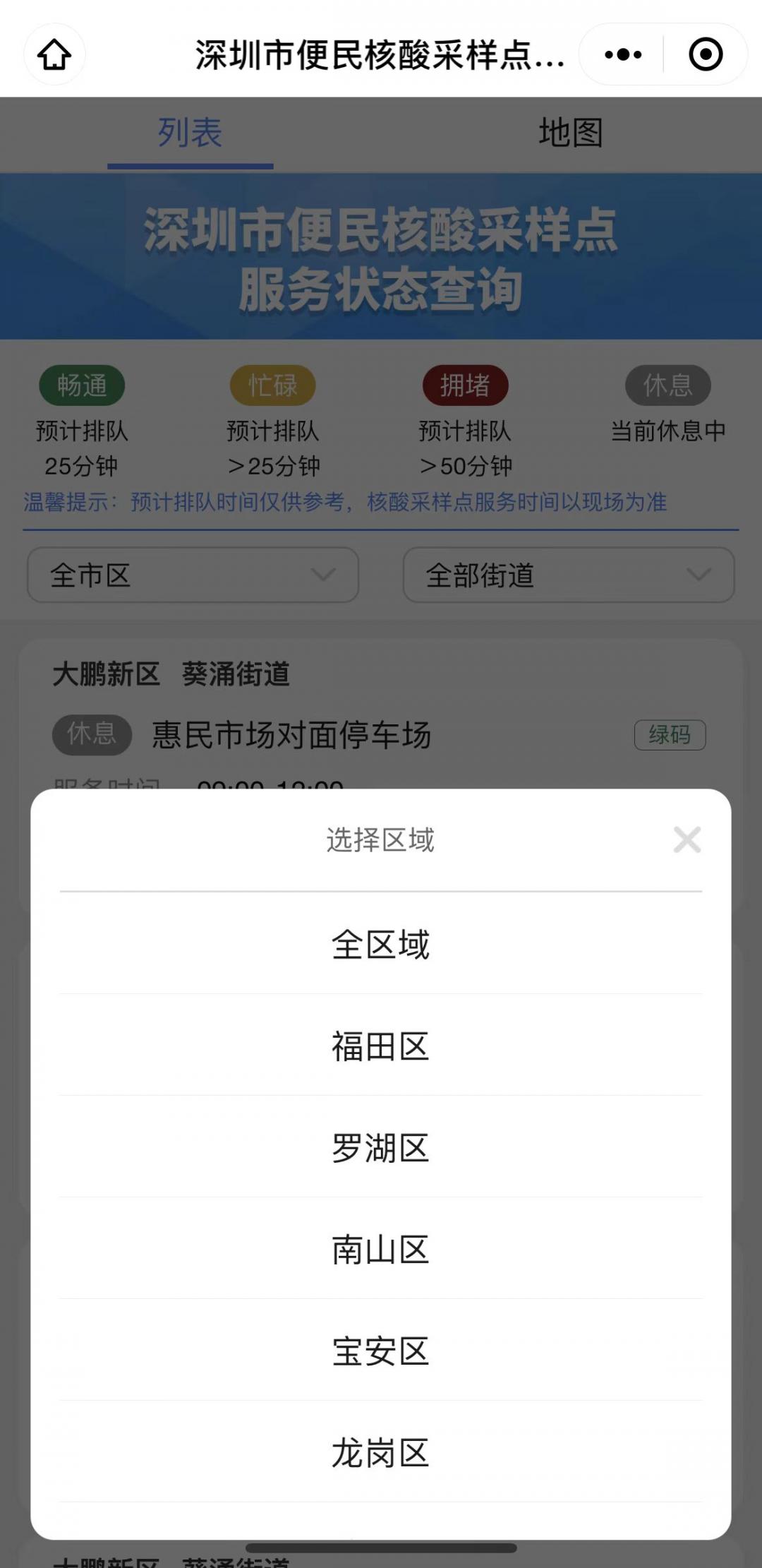 “深圳市便民核酸采样点服务状态”查询页面默认为列表查询方式,点击“全区域”可以查询深圳各区(含深汕合作区)的核酸采样点,点击“全部街道”则可定位到各个街道进行查询。