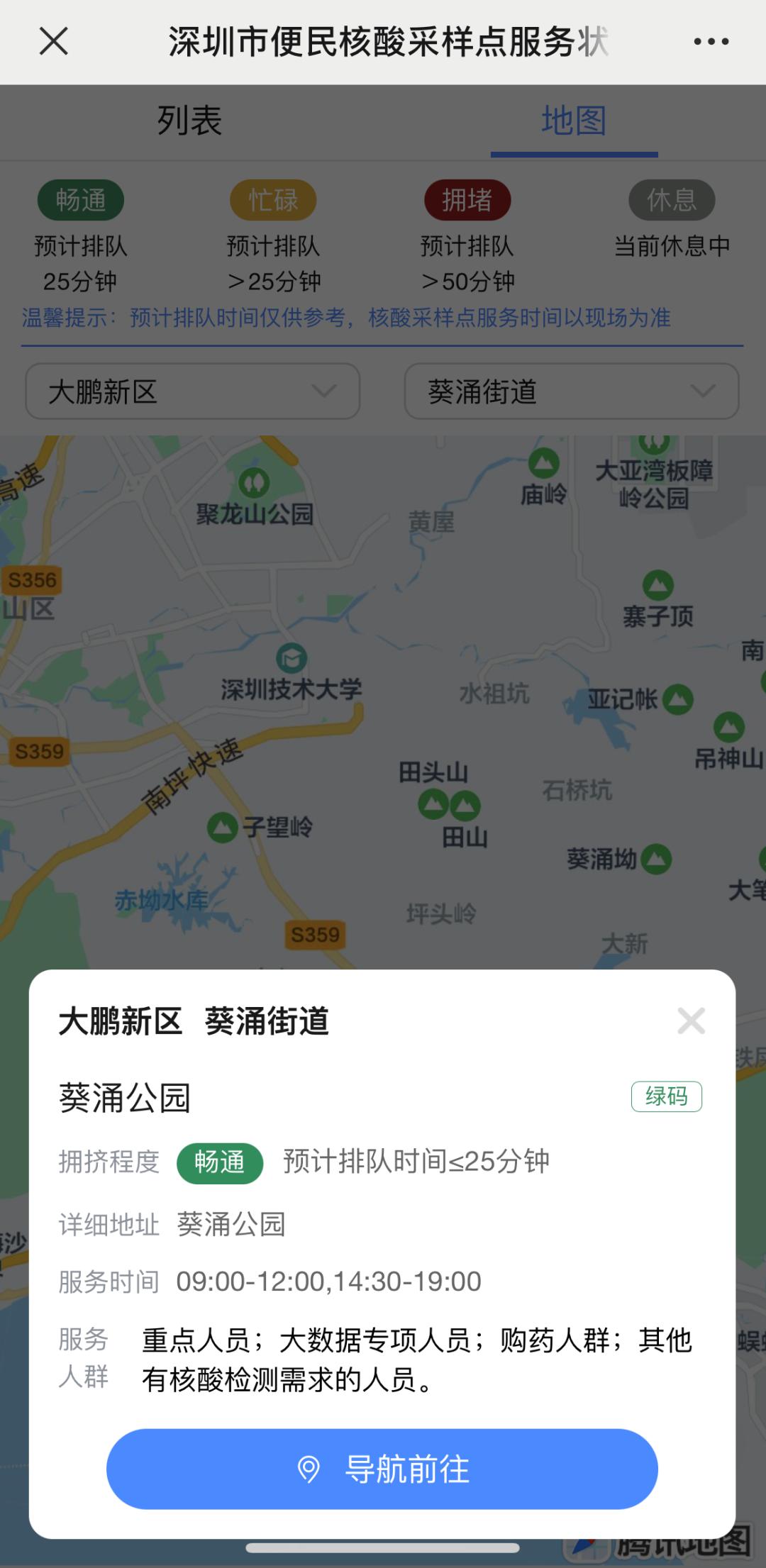 另外,“深圳市便民核酸采样点服务状态”查询页面同时提供了地图查询方式,点击想要前往的核酸采样点的图标,即可查看该核酸采样点服务状态,还可通过导航前往。