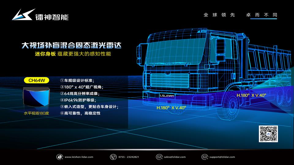 镭神智能另一重磅新品——大视场补盲激光雷达CH64W,作为专为扫除盲区设计的产品,CH64W可应用在汽车、机器人、AGV等领域的行驶盲区监测,其拥有180°x 40°的超广水平视场角,测量精度精确至±3cm,能够高效识别近距离范围内的障碍物。与镭神智能其他功能的激光雷达组合搭配,适配不同应用需求,提供更精确、全面的监测感知。