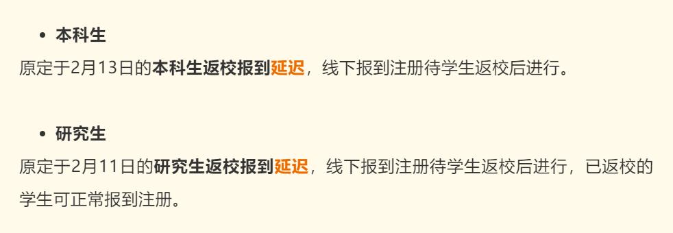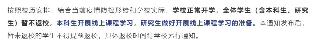 原定的本科生返校报到时间为2月18日。2月10日,该校发布通知表示,“按照校历安排,结合当前疫情防控形势和学校实际,学校正常开学,全体学生(含本科生、研究生)暂不返校,本科生2月21日起开展线上课程学习,研究生做好开展线上课程学习的准备。”