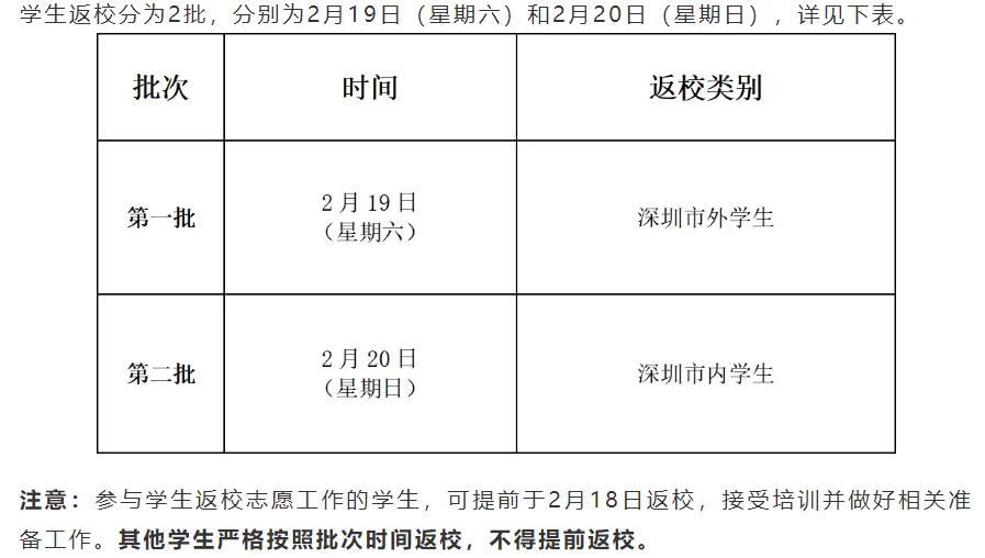 2月10日发布通知表示,2022年春季学期学生返校将分两批进行,深圳市外学生2月19日返校,深圳市内学生2月20日返校。