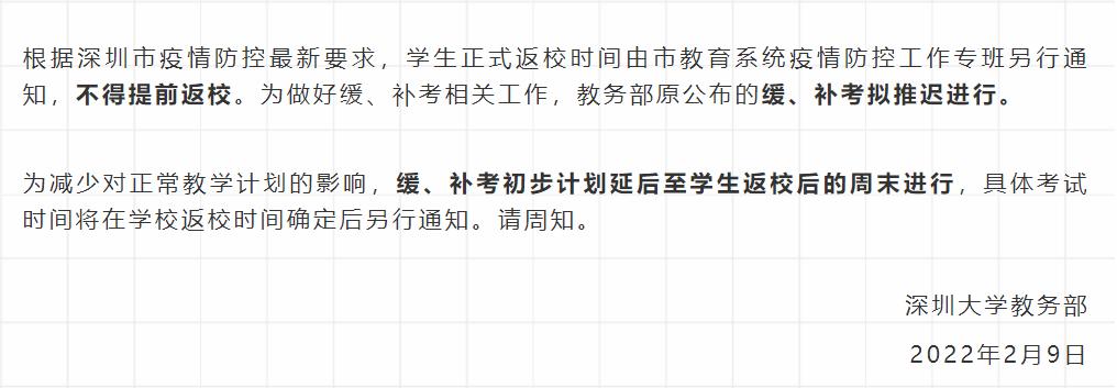 2月10日发布通知表示,根据深圳市疫情防控最新要求,学生正式返校时间由市教育系统疫情防控工作专班另行通知,不得提前返校。为减少对正常教学计划的影响,缓、补考初步计划延后至学生返校后的周末进行,具体考试时间将在学校返校时间确定后另行通知。