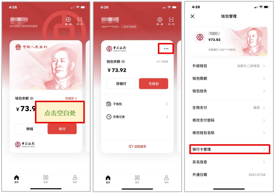点击钱包空白处,点击【...】进行钱包管理,选择【银行卡管理】-【添加银行卡】