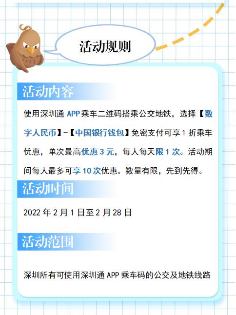 3、如您的深圳通账户有红包,扫码乘车时优先抵扣红包,按抵扣完红包后的应扣金额的1折享受优惠。