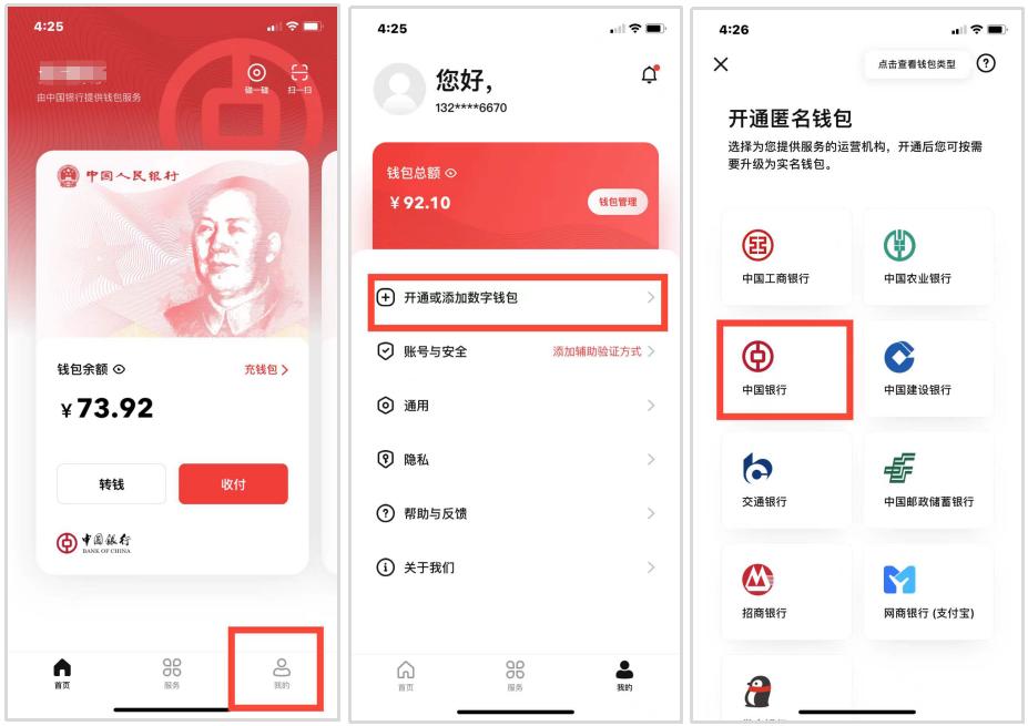 打开数字人民币APP,点击【我的】-【开通或添加数字钱包】,选择【中国银行】开通