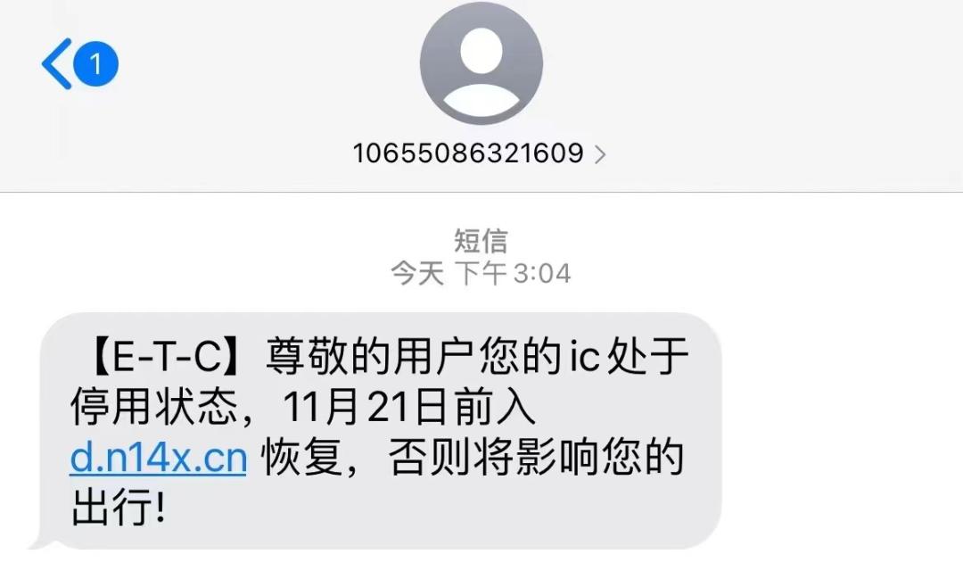 当短信中有提到“ETC被锁定”、“ETC被禁用”、“ETC被停用”等有关ETC使用受影响的内容,并诱导点击不明链接进行重新激活、认证时,请立刻打起十万分警惕!