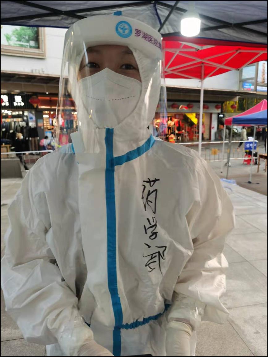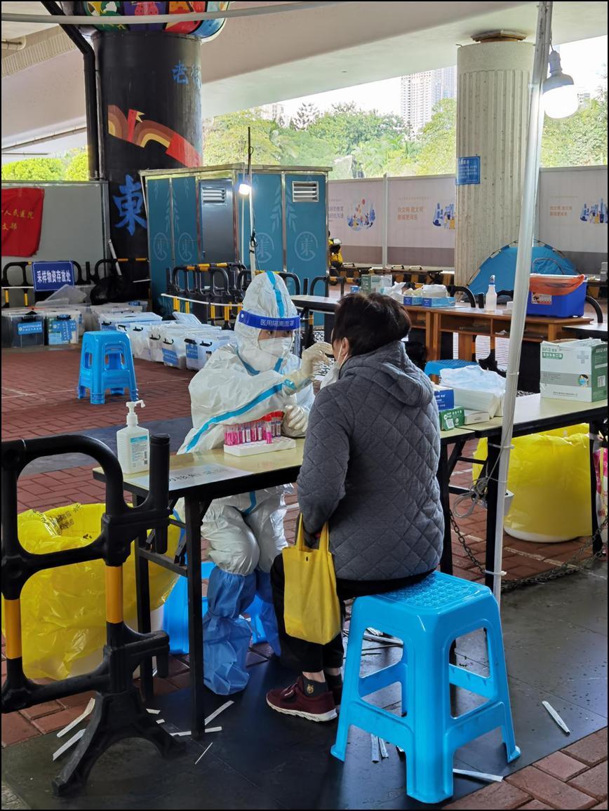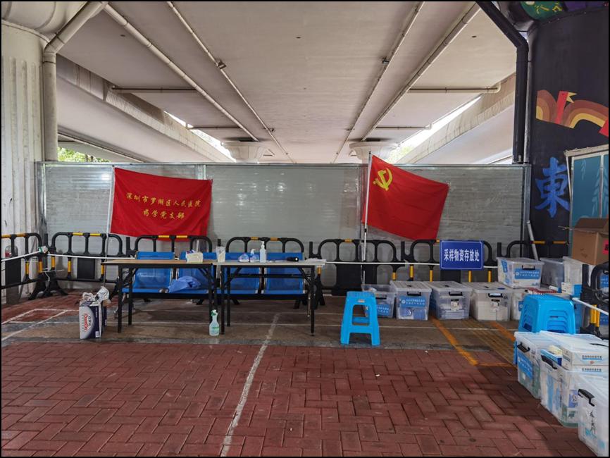 药学支部在东门街道蛟湖桥底成立了党员服务点,支部全体党员放弃休息时间,主动积极加入核酸大筛支援,其中有年近60岁不畏困苦的老一辈药师——陈梅玲同志,有家有病危老人仍坚定向前的中年药师——麦润莲同志。