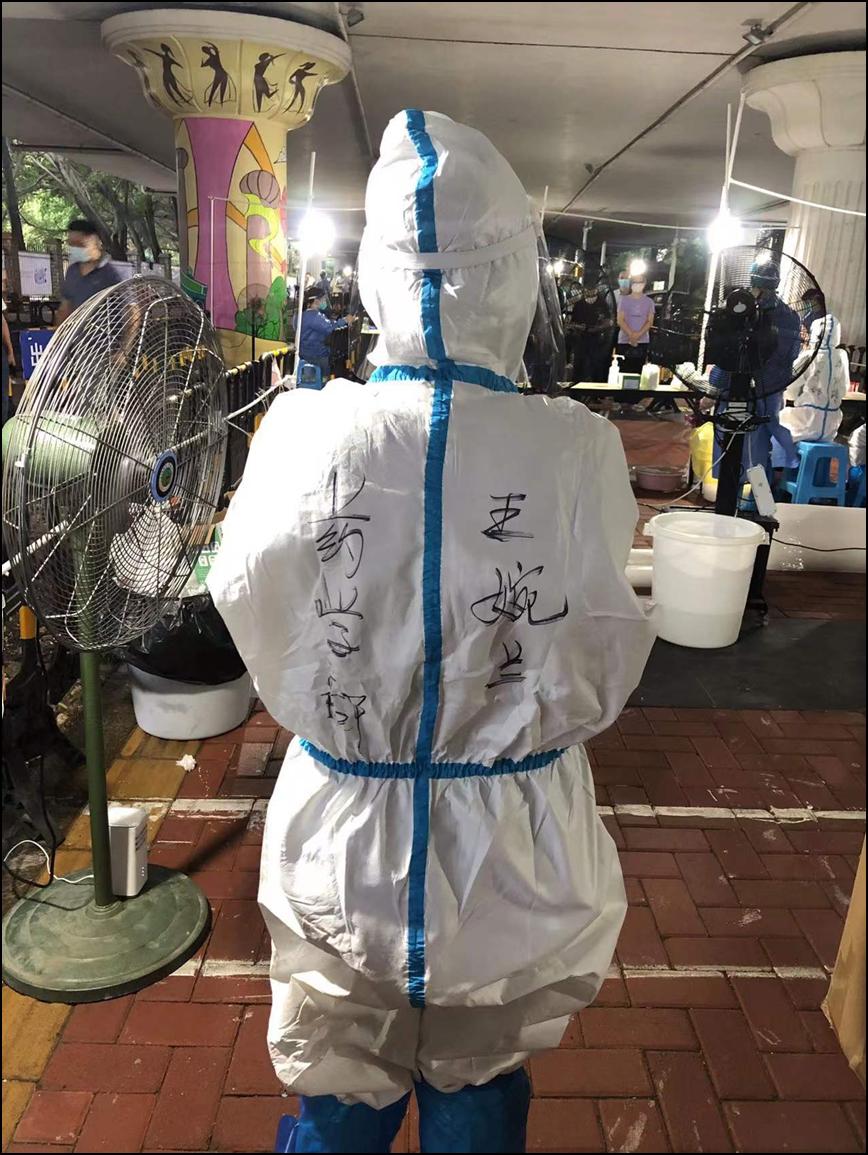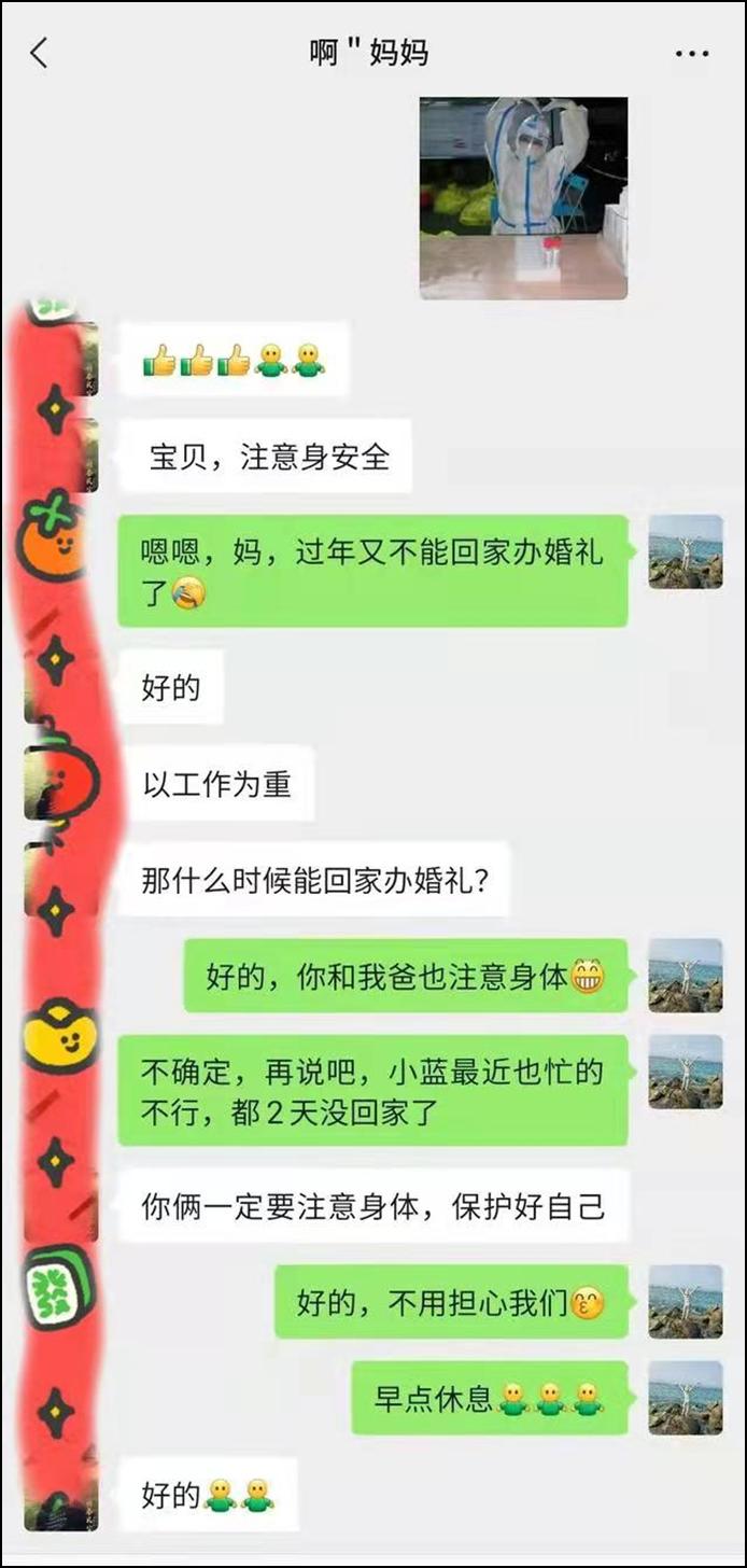 药学支部程小桂同志,也是医院的双职工,丈夫是后勤保障部的工程师,天天在各个采样点之间运送物资,保障供应,家里三胎儿子嗷嗷待哺,程小桂同志仍主动报名采样工作,三个年幼的孩子只能托付给家里的爷爷。两人虽然同一屋檐下,但两人已经好几天没能和孩子们好好说上几句话。