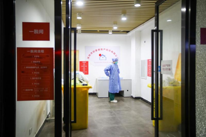 医护人员在临时改造的“一脱间”内脱去隔离衣。
