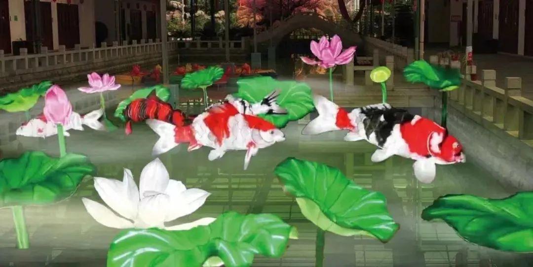 “荷塘月色”灯组中的锦鲤,在开合的花瓣旁游动、追逐,仿佛了然你的祈愿。
