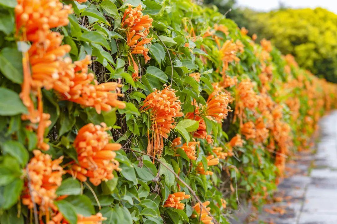 常绿大藤本。圆锥花序着生于侧枝的顶端,花冠筒状,橙红色,裂片5枚,花蕾摄合状排列,花开放后反折。橙红色的花朵累累成串,状如鞭炮,故有“炮仗花”之称。
