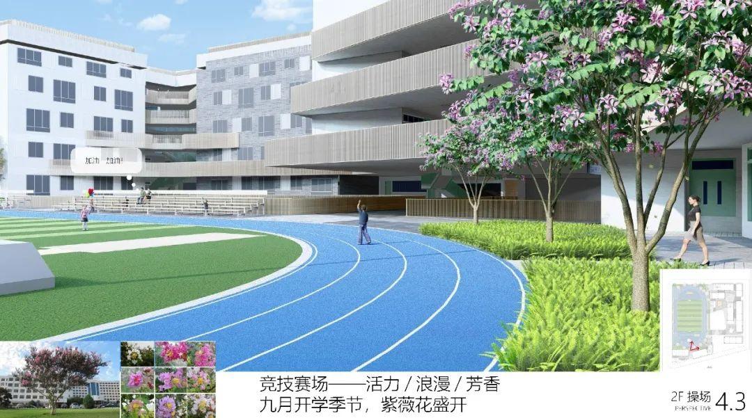 ◆在绿化方面,学校将围绕“教室城”的走向打造两个山谷,这里将种植小叶紫薇花,让满园芬芳从庭院一直蔓延到各栋建筑。每当九月开学季,便是紫薇花开时,将为孩子们带来美不胜收的校园景色。