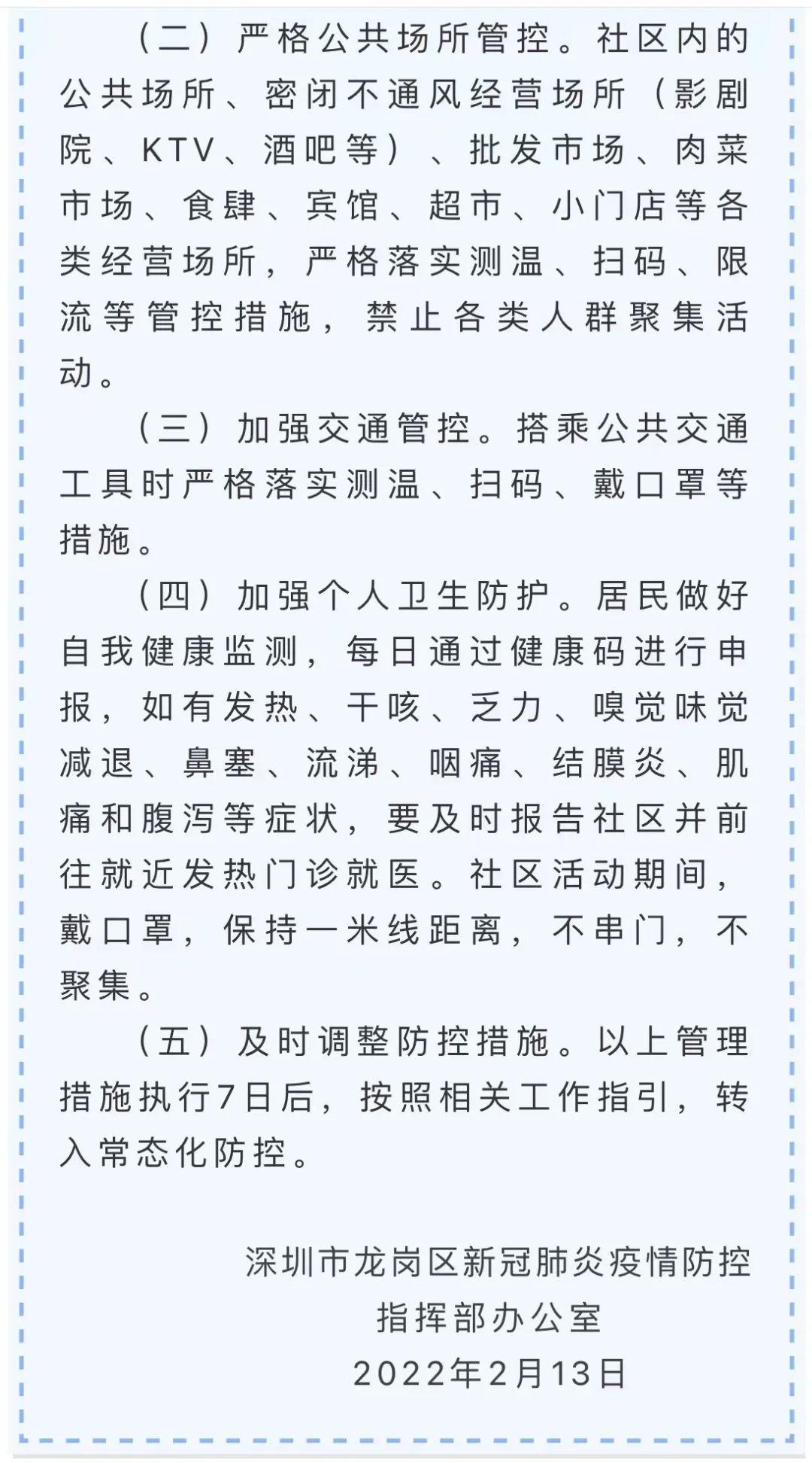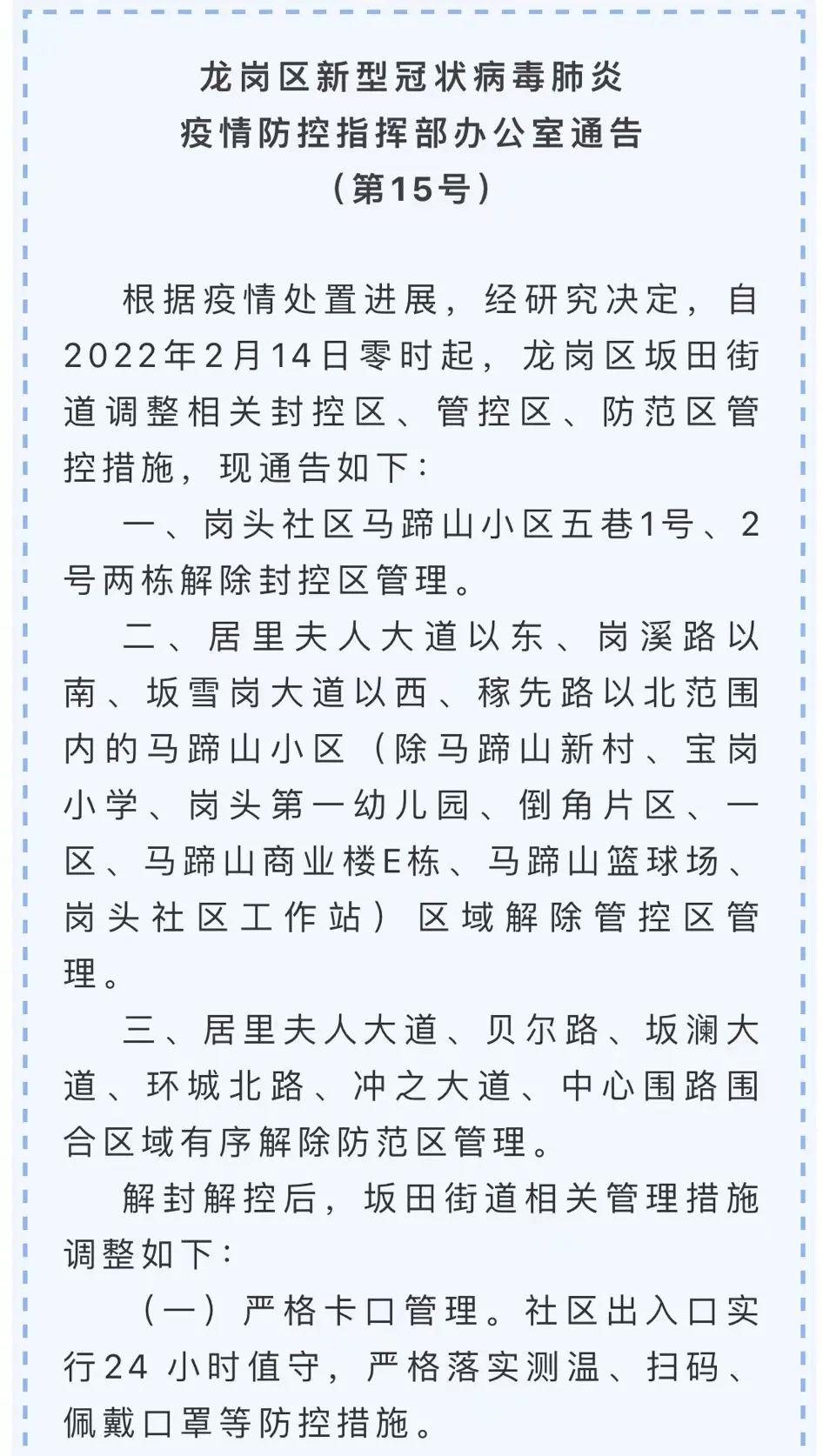 昨夜,龙岗区疫情防控指挥部办公室发布最新通告:自2022年2月14日零时起,龙岗区坂田街道调整相关封控区、管控区、防范区管控措施,具体通告如下: