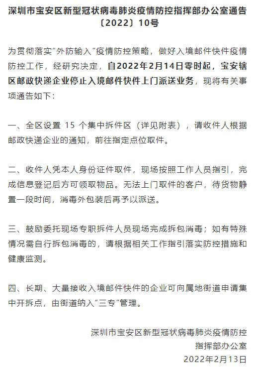 根据疫情防控要求,自2022年2月14日零时起,宝安辖区邮政快递企业停止入境邮件快件上门派送业务。