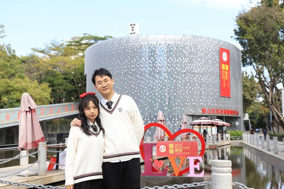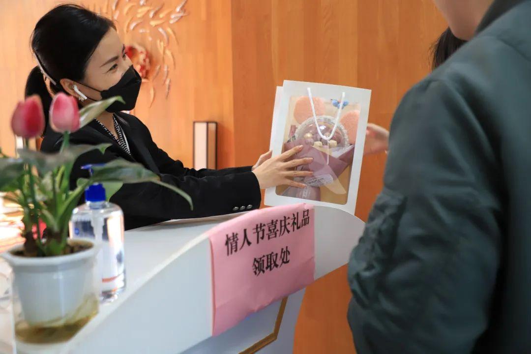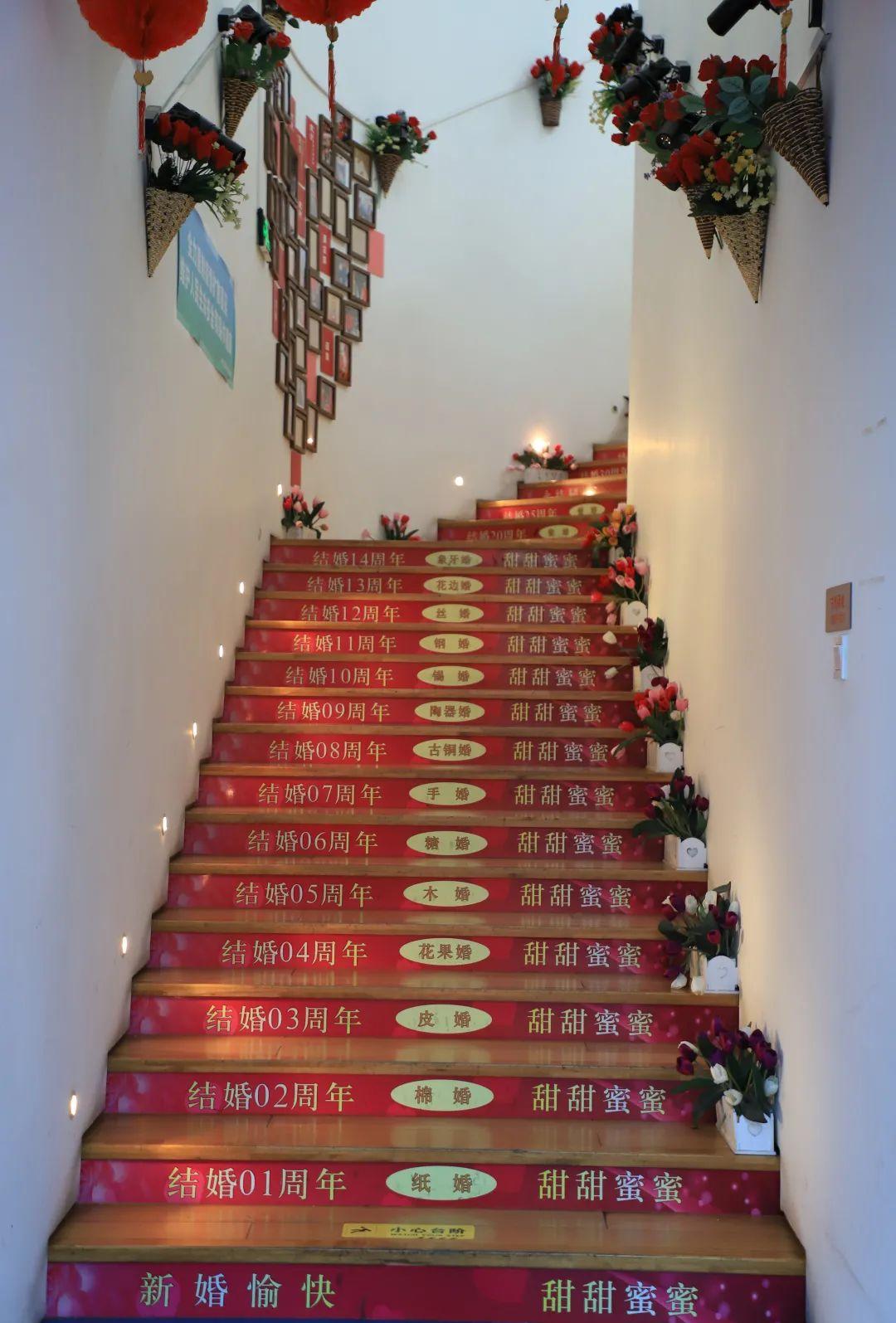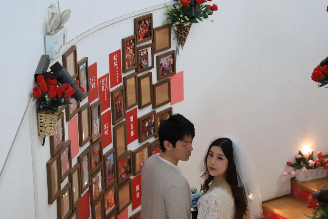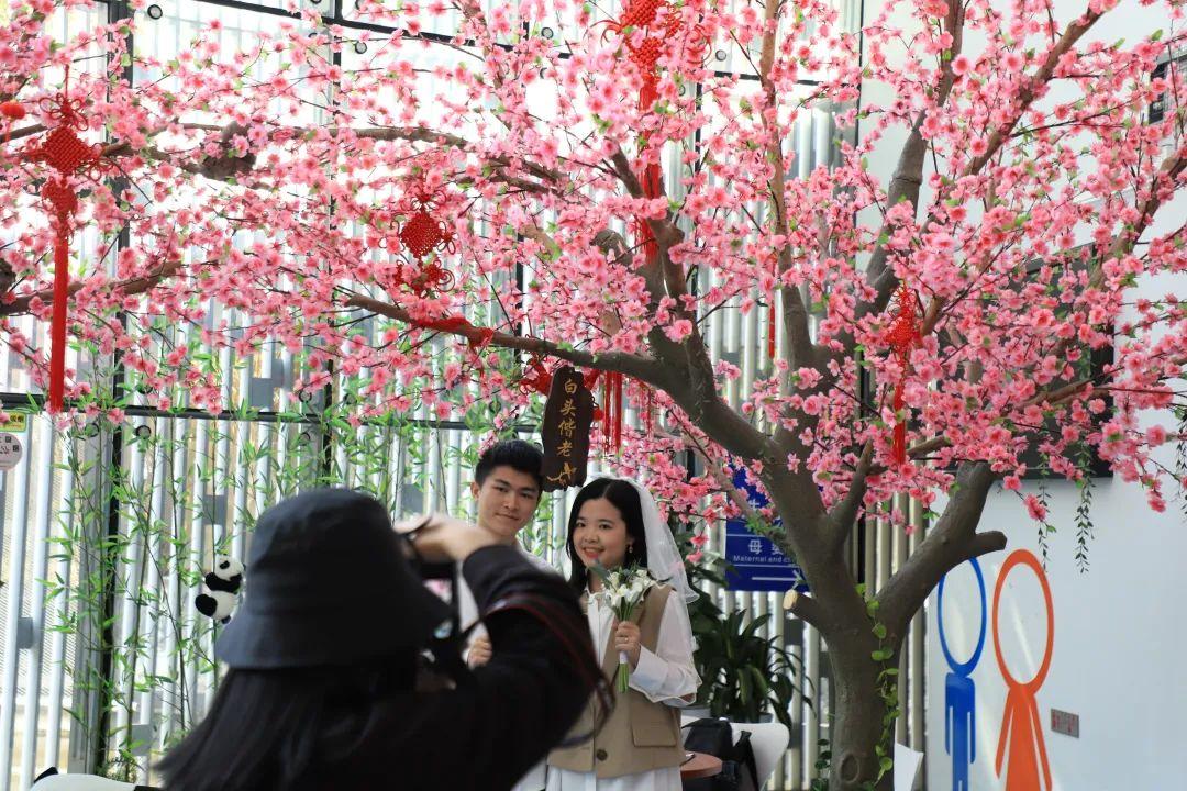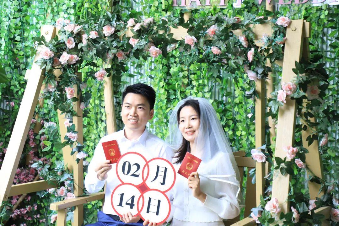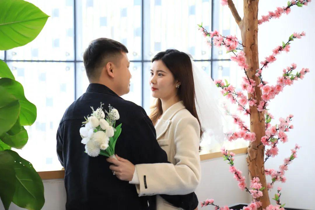走进婚姻登记处大厅,处处可见情人节的浪漫氛围。厅内设有花树、木椅、装饰墙、打卡楼梯,温馨又浪漫,吸引了不少新人打卡留下双人合照,纪念这一特殊的时刻。