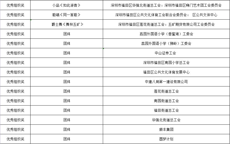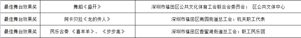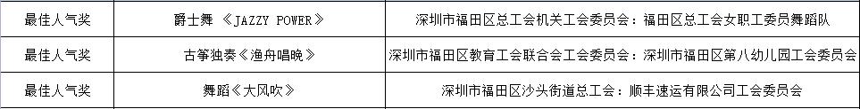 由福田区总工会主办的喜迎二十大、我们的节日系列活动之“欢乐在鹏城·喜粤过大年”暨2022年福田首届职工线上春节联欢晚会已于1月30日晚完美收官。其中,有3个单位获最佳人气奖、3个单位获最佳编排奖、3个单位获最佳节目、3个单位获最佳舞台效果奖,15个单位获优秀组织奖。