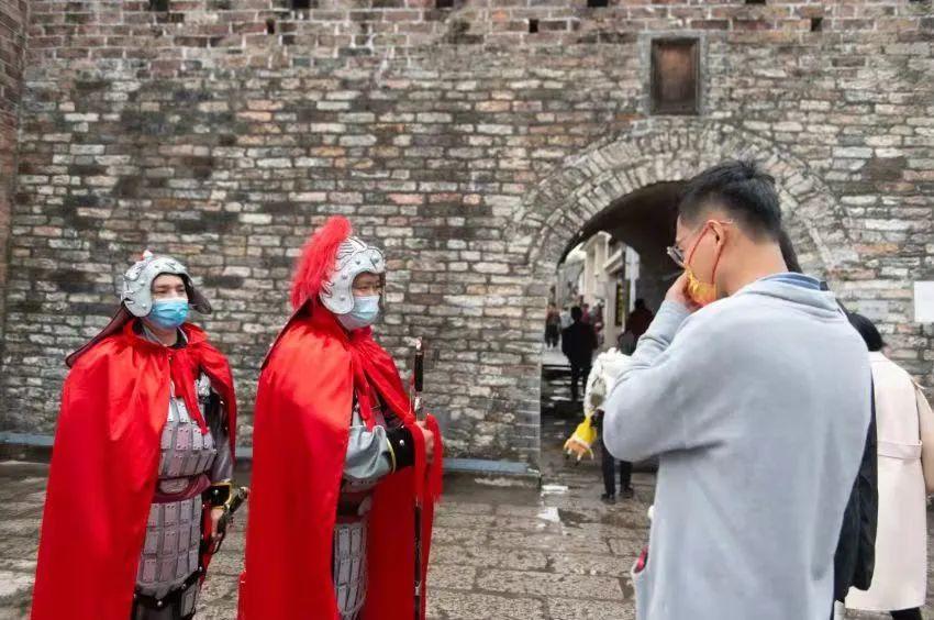 年味与人情味在所城上空弥漫开来,特邀“穿越”而来的将士进行防疫文明规劝,游客见了都说好。