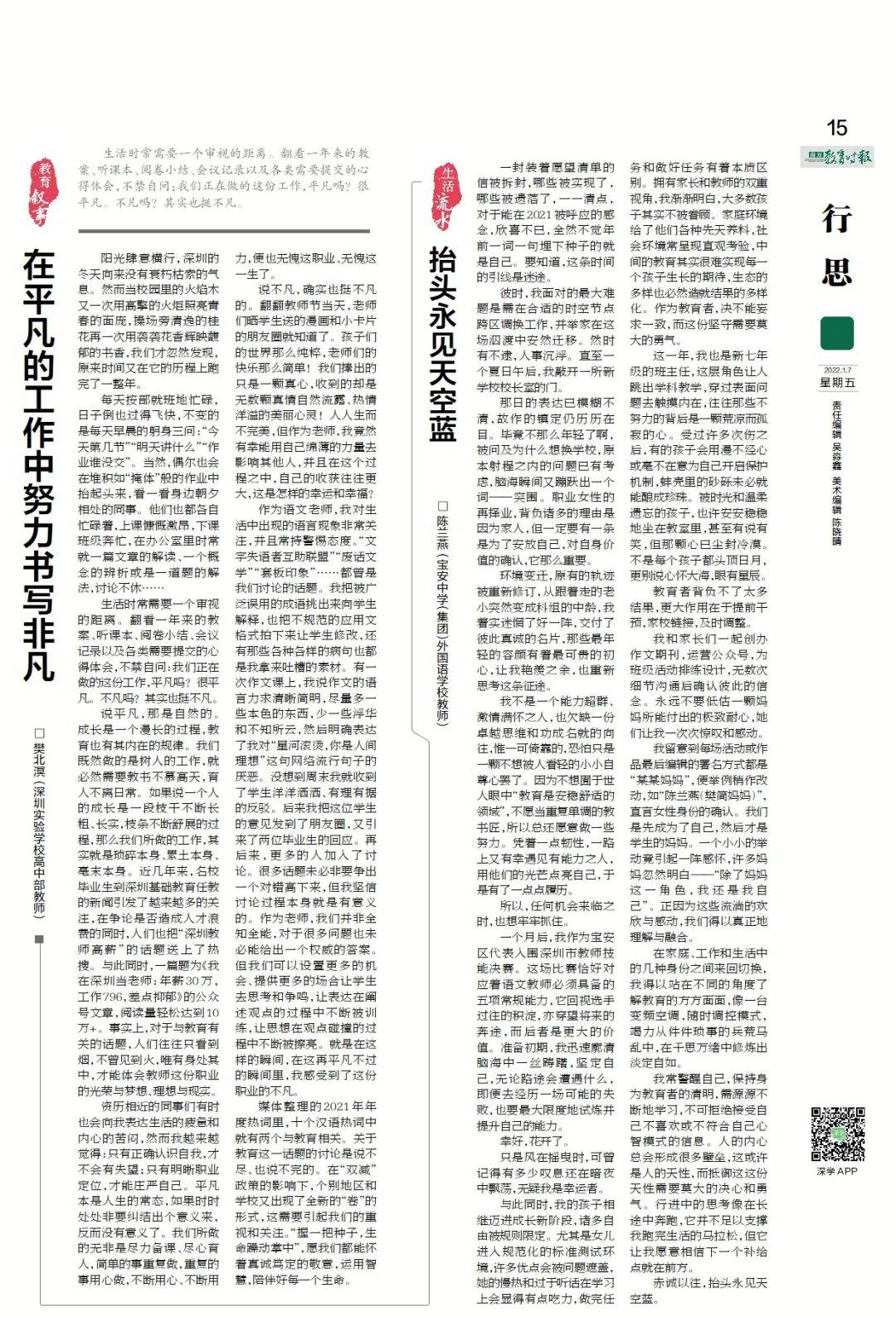说平凡,那是自然的。成长是一个漫长的过程,教育也有其内在的规律。我们既然做的是树人的工作,就必然需要教书不慕高天,育人不离日常。如果说一个人的成长是一段枝干不断长粗、长实,枝条不断舒展的过程,那么我们所做的工作,其实就是琐碎本身、累土本身、毫末本身。近几年来,名校毕业生到深圳基础教育任教的新闻引发了越来越多的关注,在争论是否造成人才浪费的同时,人们也把“深圳教师高薪”的话题送上了热搜。与此同时,一篇题为《我在深圳当老师:年薪30万,工作796,差点抑郁》的公众号文章,阅读量轻松达到10万+。事实上,对于与教育有关的话题,人们往往只看到烟,不曾见到火,唯有身处其中,才能体会教师这份职业的光荣与梦想、理想与现实。