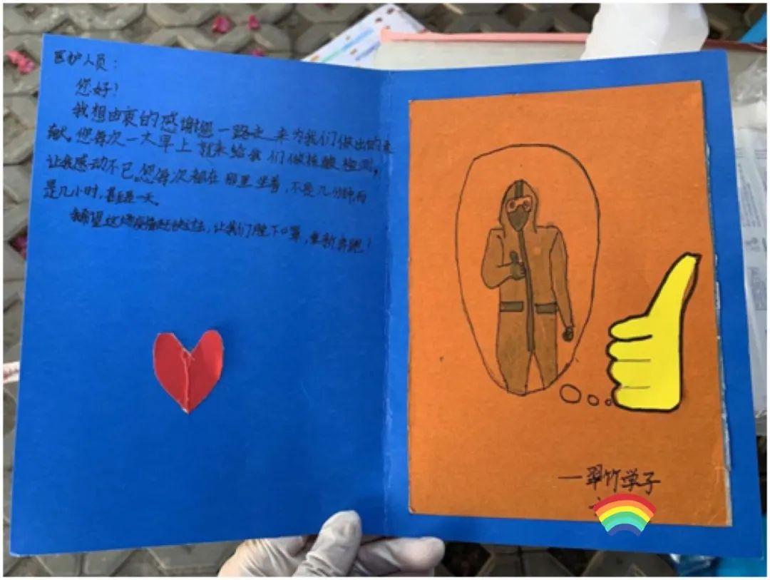 在东门街道采样时,一名身穿校服佩戴红领巾的学生,对医务人员恭敬地敬了个少先队队礼,随后从包里小心翼翼地拿出一张亲手绘制的感谢卡递到了采样人员的手里,封面写着:“医护人员,您辛苦了!”