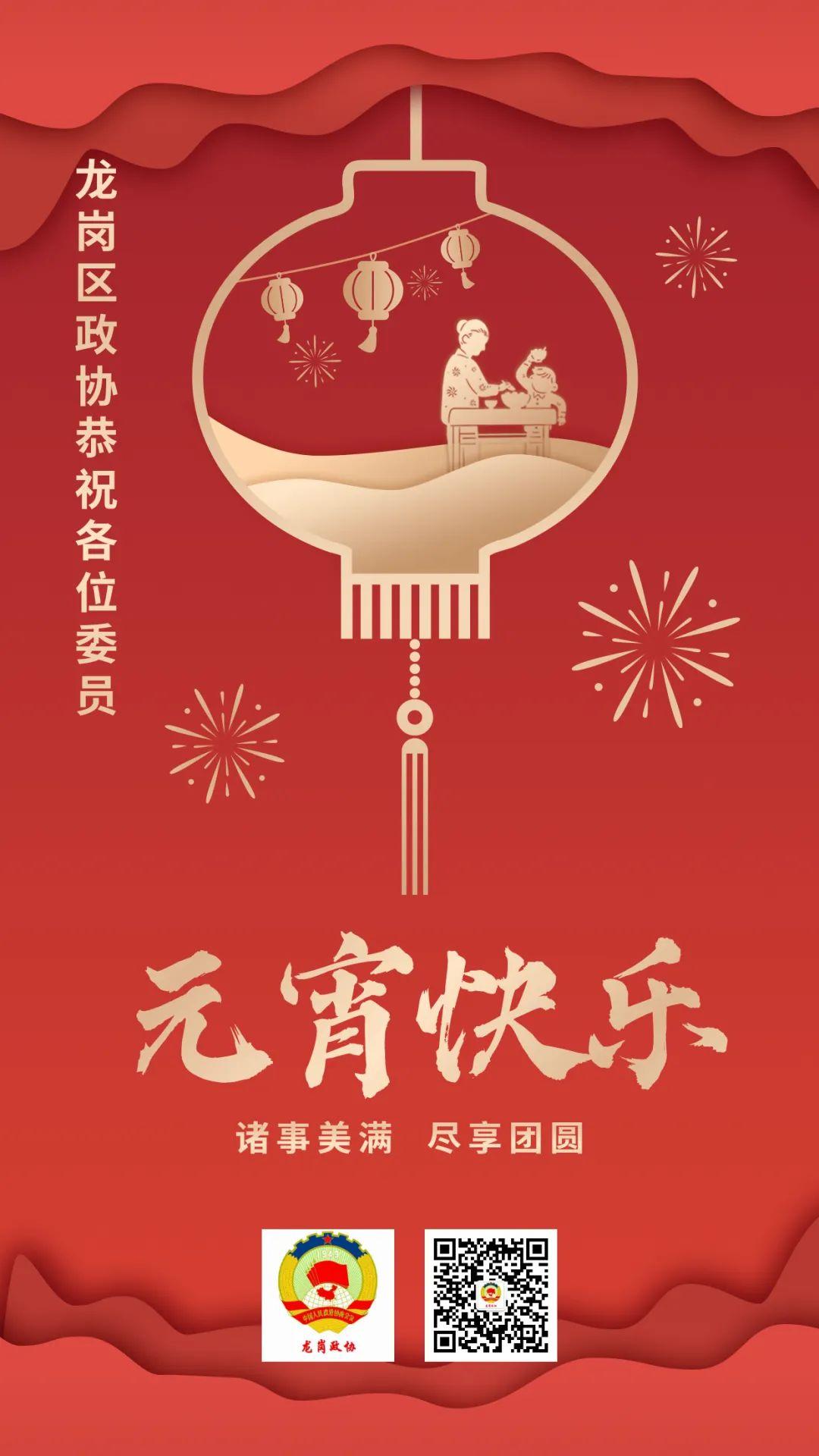 灯火映万家,良宵共团圆。值此虎年元宵佳节到来之际,龙岗区政协谨向全体政协委员和社会各界人士致以诚挚的节日祝福。祝各位元宵节快乐,团团圆圆,阖家安康!
