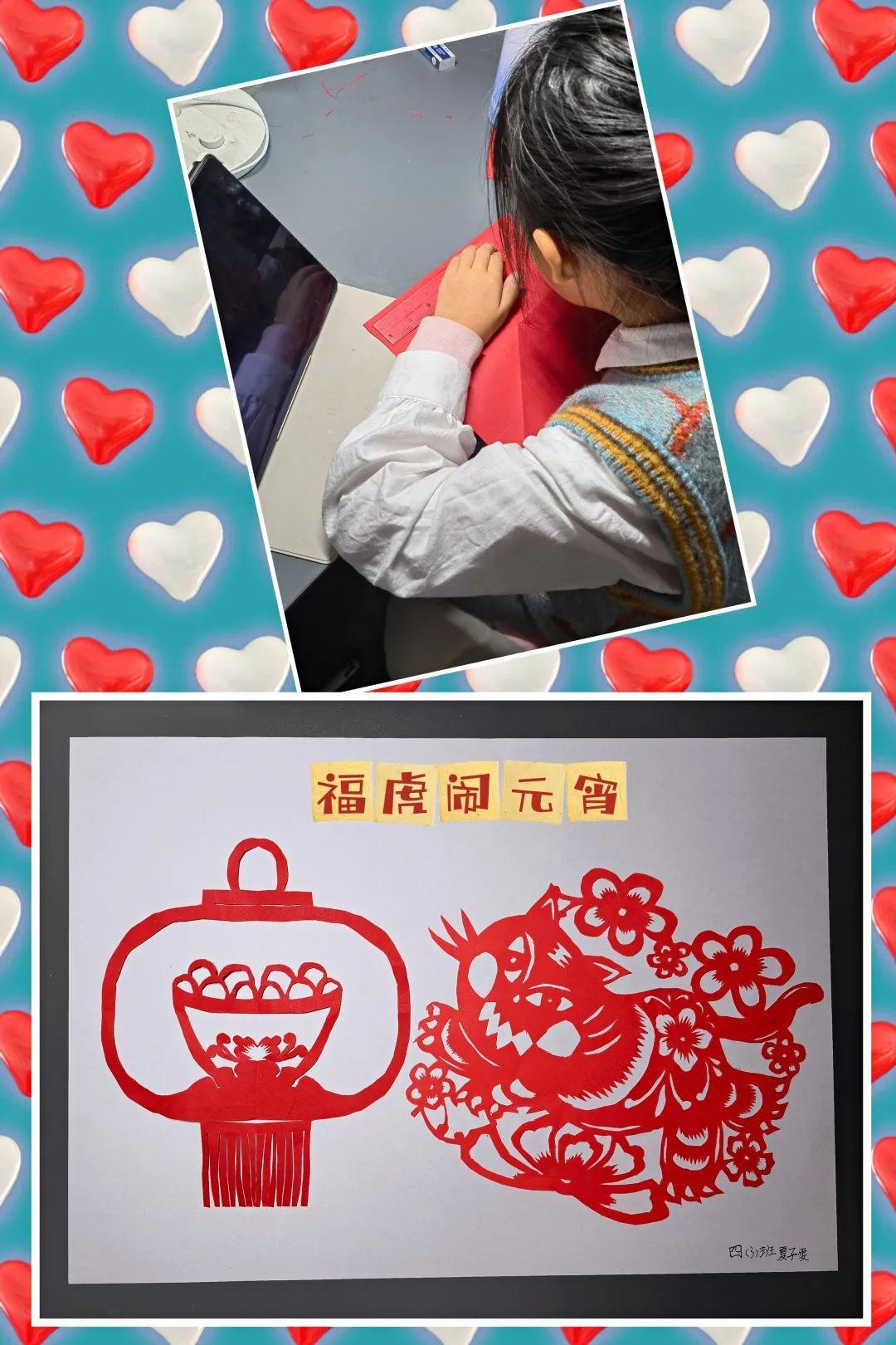 “我自己动手用剪纸来庆祝元宵佳节,把元宵佳节中最常见的灯笼和元宵融合在一起,再添加虎年和立春的特色,剪出两幅作品融合在一起就是《福虎闹元宵》!”