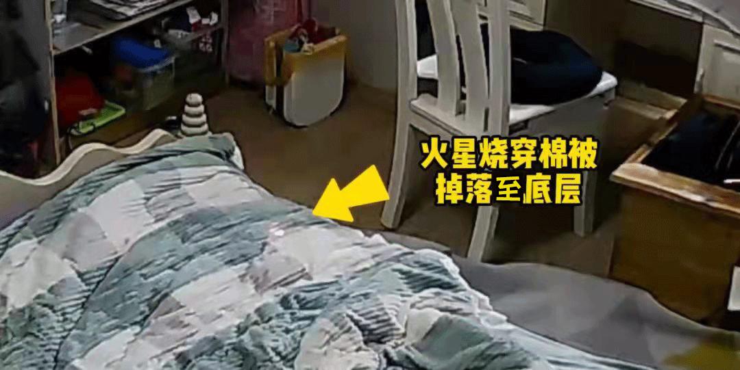 男孩发现后,出门熄灭烟花,返回房间检查棉被表层,用另一截棉被,遮住被烧穿的小洞后“安心”离开。但孩子不知道的是,此时火星正在被子内部“阴燃”。