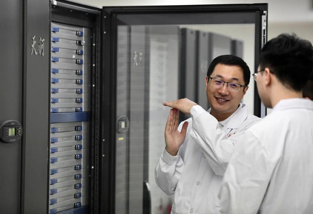 国家超级计算天津中心天河应用研发首席科学家、教授级高级工程师孟祥飞(左)和同事一起巡查“天河三号”原型机机房 新华社记者 赵子硕 摄