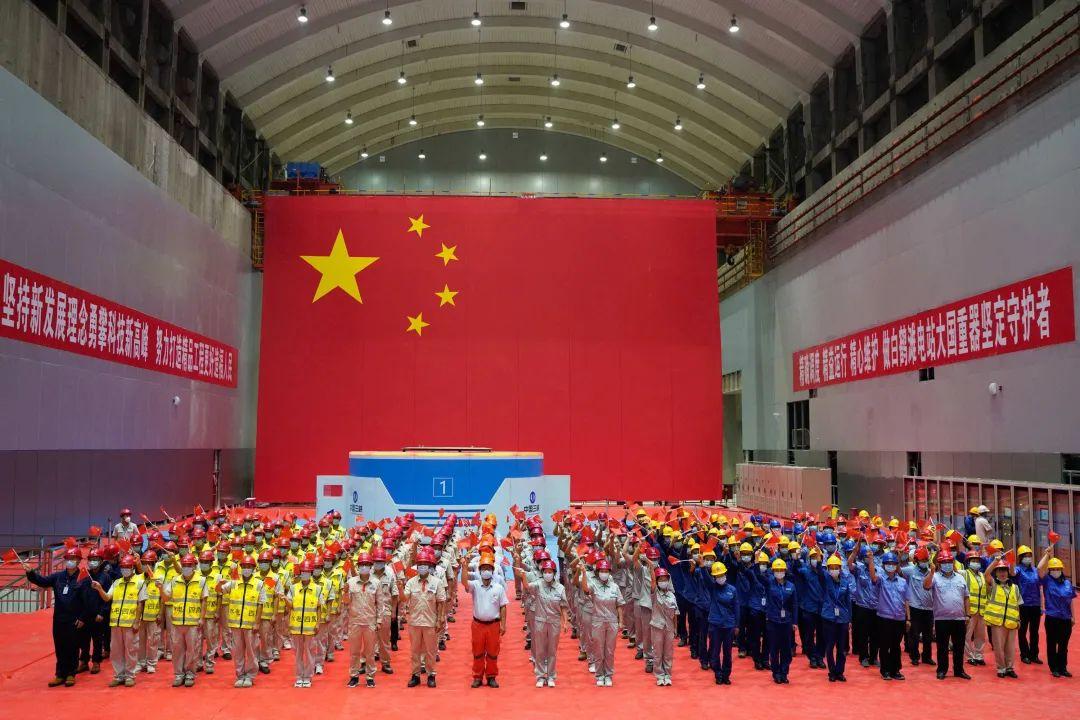 2021年6月28日,当今世界在建规模最大、技术难度最高的水电工程——白鹤滩水电站首批机组投产发电。图为建设者参加投产发电仪式。新华社记者 刘梦琪 摄